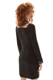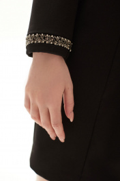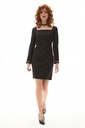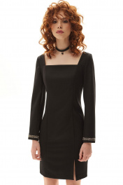 Платье полуприлегающего силуэта, без воротника, с квадратным вырезом горловины, с застежкой на потайную молнию по спинке. По переду с рельефами, выходящими из горловины. Правый рельеф переда заканчивается разрезом. По спинке сог средним швом, рельефами, выходящими из горловины. Рукав втачной, длинный. Низ рукава с отрезной манжетой, декорированной тесьмой.. Платье без подкладки.