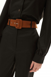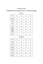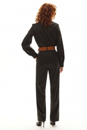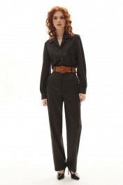 Блузка с центральной застежкой на петли и пуговицы, отложным воротником и лацканами. Полочки с нагрудными вытачками. Спинка цельная. Рукав втачной, длинный, с отрезной манжетой. Брюки с отрезным поясом, застежкой –гульфик. Передние половинки с карманами, вход в карман наклонный к боковому шву. Комплект со съемным поясом.