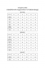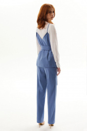 Блузка с центральной потайной застежкой на петли и пуговицы, втачным воротником с отрезной стойкой. Плечевой шов переходящий на перед. Спинка цельная. Рукав втачной, длинный, с отрезной манжетой. Жилет прямого силуэта, на бретелях, с фигурным вырезом горловины. Бретели зафиксированы к жилету петлями и пуговицами. Брюки прямые, с отрезным поясом, по спинке пояс присборен на резинку. На передних половинках расположены карманы. Вход в карман наклонный к боковому шву. Застежка- гульфик. Комплект со съемным поясом.