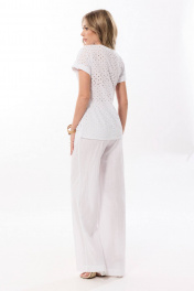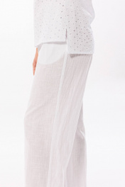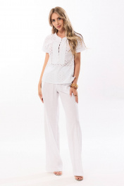 блузка с центральной застежкой на навесные петли и пуговицы по вставке переда. Воротник отрезной- стойка. По вставке переда- четыре складки- защипа. Спинка со средним швом. Рукав короткий, цельнокроенный, с отложной манжетой. Брюки- с отрезным поясом. Пояс присборен на резинку. По боковым швам расположены карманы. Вход в карман наклонный к боковому шву.