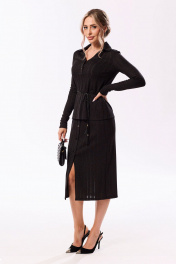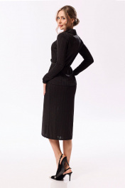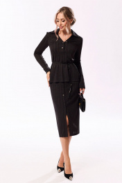 Блузон, с центральной застежкой по планке переда на петли и пуговицы, с отложным воротником. По переду с нагрудными вытачками. Спинка цельная. Рукав втачной, длинный. Юбка прямая, без пояса, верх присборен на резинку. Переднее полотнище со средним швом, заканчивающимся щлицей. По среднему шву отрезная планка с декоративными пуговицами. Комплект с декоративным съемным поясом.