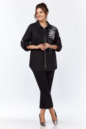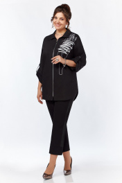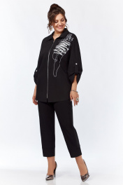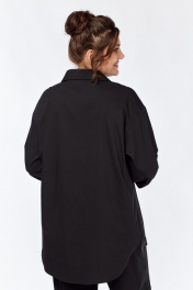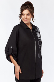 Рубашка женская, со спущенным плечом, с застежкой на молнию. Перед с нагрудными вытачками, идущими от центра груди к боковым швам. С левой стороны переда расположена дизайнерская вышивка . Спинка без среднего шва. Рукава длиной ¾, с патами. Воротник стояче-отложной с цельно-кроенной стойкой. Низ изделия не ровный.