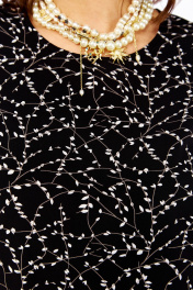 Блузка женская, полуприлегающего силуэта. Перед с нагрудными вытачками , идущими от центра груди к боковым швам. По низу переда расположены 2 складки. Низ переда обработаны обтачкой. Спинка со средним швом. По низу в среднем шве расположен разрез. Сверху застежка на петлю и пуговицу. Низ спинки не ровный. Рукава втачные, 3\4, по низу рукава складка. Низ обработан окантовкой.