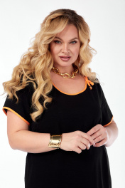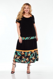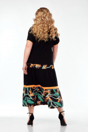 Платье женское, длинное, прямого силуэта. Перед с нагрудными вытачками, идущими от центра груди к боковым швам, с горизонтальными членениями и вставкой из отделочной ткани. Два яруса со сборкой по шву притачивания. Спинка со средним швом , с горизонтальными членениями и вставками из отделочной ткани, два яруса со сборкой по шву притачивания. Рукава втачные, короткие. Низ рукава и горловина обработаны окантовкой из отделочной ткани. По горловине расположен бантик из отделочной ткани.