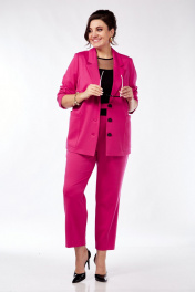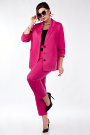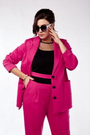 Костюм женский 2-х комплектный из трикотажной ткани. Жакет прямого силуэта, без подкладки. Перед с центральной бортовой застёжкой на три петли и пуговицы с нагрудными вытачками, идущими от бокового шва к центру груди. По переду расположены накладные карманы. Спинка без среднего шва, воротник пиджачного типа. Рукава длинные, втачные, двухшовные. Внутри жакета, к боковому шву, крепится декоративная пата. Брюки свободного кроя. По переду брюк расположены боковые накладные карманы, застроченная складка от пояса. По низу брюк есть вытачка. Брюки на поясе с резинкой.