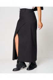 Эта лаконичная, эффектная и универсальная юбка насыщенного чёрного цвета создана для тех, кто любит сочетание строгой эстетики и модной динамичности. Плотная, гладкая ткань держит форму и обеспечивает аккуратный, структурный силуэт, подчёркивая линию талии и визуально вытягивая фигуру. Особое внимание привлекает асимметричный линийный крой и выразительный длинный разрез спереди, который добавляет образу женственность, смелость и лёгкую нотку драматичности. Юбка выглядит одновременно современно, минималистично и очень утончённо, подходит как для будней, так и для особых выходов. Благодаря продуманному дизайну модель легко сочетается с базовыми футболками, объёмными свитерами, строгими блузами и массивной обувью, позволяя создавать стильные, уверенные и гармоничные образы. Идеальна для женщин, которые выбирают качественные, выразительные и функциональные вещи с характером.