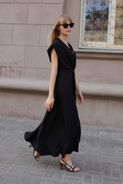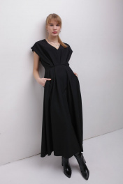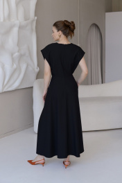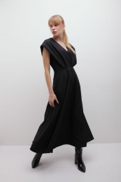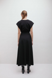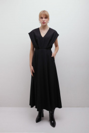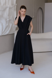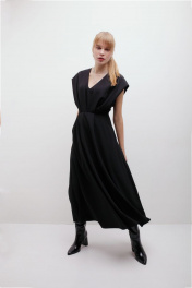 Платье из крепа с глубоким V-образным вырезом и расклешеной юбкой. Застёгивается на потайную молнию, на подкладке. Деликатная ручная стирка температура воды до 30°C - Гладить при температуре утюга до 110°C - Не отбеливать - Барабанная сушка запрещена - Сухая чистка (химчистка)