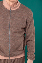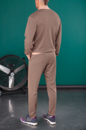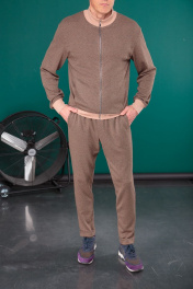 Мужской комплект выполнен из жаккардового трикотажа, переплетение трех цветов дают неоднородный цвет и фактуру. Брюки свободного прилегания с поясом на резинке с дополнительной стяжкой, сзади прорезной карман, по передней части брюк два боковых кармана, снизу отворот. Джемпер с воротником стойкой на молнии, в рельефы по переду вставлены карманы; манжеты, а так же горловина, на плотной кругловязанной трикотажной резинке кашкорсе. Длина джемпера по спинке с манжетой 69+-1см., длина рукава от плечевого шва с манжетой 69см. Длина брюк по боковому шву 100+-1см., по внутренней стороне 77см.