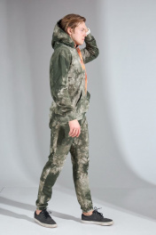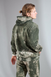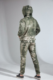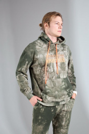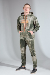Мужской костюм выполнен из хлопкового футера 3х-нитка с необычным цветом. Худи с капюшоном, имеет приспущенный рукав и настрочной карман-кенгуру, манжеты на трикотажном довязе в цвет изделия. По переду принт из яркой плёнки «good karma», в капюшон вставлен шнурок в цвет принта. Брюки с боковыми карманами, по поясу на резинке. Снизу на трикотажном манжете в цвет изделия. Длина худи по спинке 63 (+/- 1 см.). Длина рукава от горловины 71 см. Длина брюк по боковому шву 101 (+/-1 см.), по шаговому шву 76 см. Рост модели на фото 182 см.