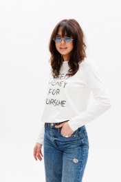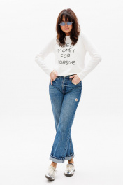 Повседневный женский лонгслив выполнен из хлопкового трикотажа, благодаря чему очень приятен к телу. Изделие универсального прямого силуэта свободного кроя. Благодаря прямому крою лонгслив отлично подходит разным типам фигур, хорошо сидит и не стесняет движений. Вырез горловины круглый, рукав длинный. По переду декор в виде модного принта(надпись). Лонгслив — отличный вариант для повседневной активной жизни. Длина от горловины по спинке 53 +-1 см., длина рукава от горловины 76 +-1 см. Рост модели на фото 178 см, размер S (44).