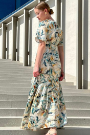 Платье женское длинное из вискозы, отрезное по линии талии на резинке. Рукав - реглан, короткий. Изысканная принтованная расцветка.
