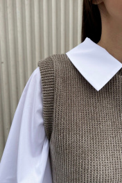 Туника женская свободного кроя, горловина обработана воротником из отделочной ткани, по низу в боковых шках разрезы. Рукава свободного кроя из отделочной ткани, низ рукава на резинке. Смежные размеры. Длина - середина бедра.