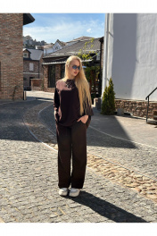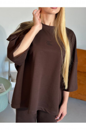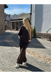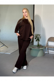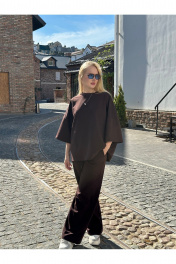 Современный костюм оверсайз. Выполнен из мягкого трикотажа 2х нитка (95% хлопок, 5% лайкра), который приятно прилегает к телу, тянется и сохраняет форму. Майка прямого свободного кроя oversize со спущенной линией плеча и углублённой проймой. Круглый вырез обработан притачной обтачкой (2 см). Длина — чуть ниже линии бёдер. По центру переда — декоративная надпись. Брюки-палаццо прямого силуэта с чистой линией кроя. В боковых швах — карманы с отрезным бочком. Притачной пояс (5 см) на резинке с отделочной строчкой и внутренней кулисой со шнуром обеспечивает комфортную посадку. Сдержанный, актуальный комплект для городских и повседневных образов. one size 44-50. one size plus 52-60.
