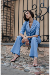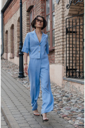 Костюмом из голубого льна — идеальный выбор для теплых дней, когда хочется выглядеть элегантно и чувствовать себя свободно. Брюки-палаццо — это настоящее воплощение легкости и женственности. Широкие, свободные по крою, с высокой посадкой, они обеспечивают максимальный комфорт и свободу движений. Благодаря натуральному материалу, брюки отлично дышат, не сковывают движения и создают ощущение прохлады даже в самую жаркую погоду. Задняя часть на резинке позволяет идеально сесть по фигуре, подчеркивая линию талии и обеспечивая удобство при носке. Такой крой подходит для любой фигуры и добавляет образу нотки непринужденной элегантности. Длина брюк 104 см. Короткий жакет прямого силуэта — это стильный акцент в комплекте. Он выполнен из той же ткани, что делает образ гармоничным и целостным. Жакет прямого силуэта подчеркивает линию плеч и визуально удлиняет ноги. Карманы добавляют практичности и позволяют держать мелкие предметы под рукой. Длина рукава 35 см, длина жакета по спинке 53 см.
