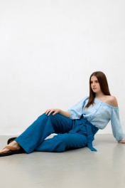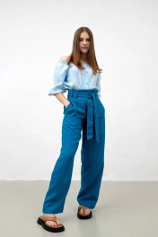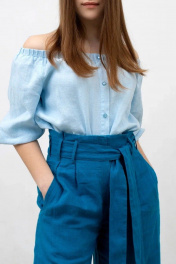 Брюки женские с цельнокроеным поясом из 100% льна. На передних половинках брюк боковые прорезные карманы с листочкой. Застежка на тесьму-молнию в переднем шве и на потайную петлю-пуговицу на поясе. По линии талии застрочены по две складки. Задние половинки с вытачками по линии талии. Длина изделия по боковому шву 110 см. Стирка при t 30 °C.