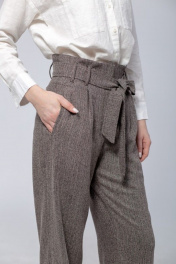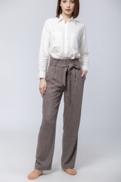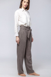 Брюки женские с цельнокроеным поясом из 70% вискозы, 30% п/э. На передних половинках брюк боковые прорезные карманы с листочкой. Застежка на тесьму-молнию в переднем шве и на потайную петлю-пуговицу на поясе. По линии талии застрочены по две складки. Задние половинки с вытачками по линии талии. Длина изделия по боковому шву 110 см. Стирка при t 30 °C.
