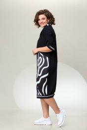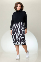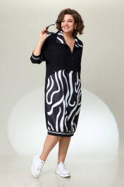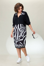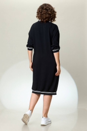 Платье женское свободного силуэта, горловина со стойкой, рукав спущенный 3/4по низу на декоративной резинке. Изделие комбинированное из двух тканей. По переду декоративная, функциональная застежка на тесьму молнию. По низу платье с декоративной резинкой. Длина рукава – 39см, длина изделия – 108см