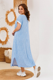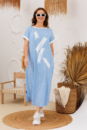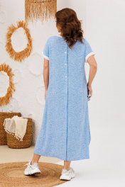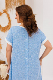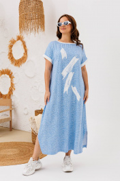 Платье женское свободного силуэта в стиле «боххо», вырез горловины округлый с декоративной трикотажной резинкой. Изделие без рукава со спущенной линией плеча и отделкой по низу. В боковых швах карманы и фигурные разрезы по низу. Декором является принт по полочке. По спинке – имитация планки с пуговицами. Платье без застежки. Длина изделия 122см