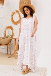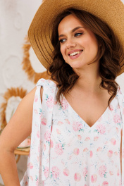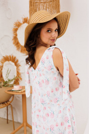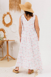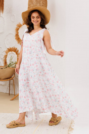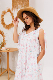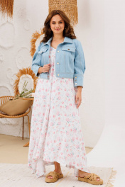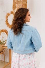 Комплект состоит из жакета и платья. Жакет-джинсовка приталенного силуэта, воротник рубашечный, рукав втачной на широкой манжете со складкой. По переду клапаны и застежка на петли пуговицы. Платье-сарафан свободного силуэта, вырез горловины V-образный по переду и спинке изделие без рукавов и без застежки. По плечам завязки из основной ткани, в боковых по низу разрезы. Р-р 50: Длина платья – 113 см, длина жакета - 44см, длина рукава - 48см.