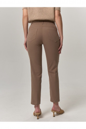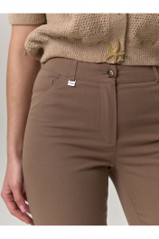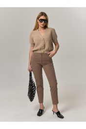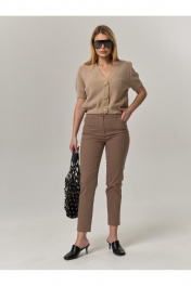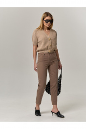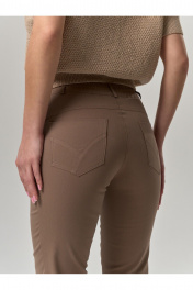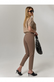 1. Брюки женские облегающего силуэта, немного укороченные. 2. Верхний срез брюк обработан притачным поясом с резинкой по задней части . 3.Застежка молния и обметанная петля пуговица. 4.На передних частях выполнены боковые карманы с отрезным бочком с отделочными строчками. 5. Спинка с кокетками и накладными карманами. 6. Длина шагового шва-71 см. 7. Бережная стирка при 30 градусах.