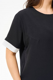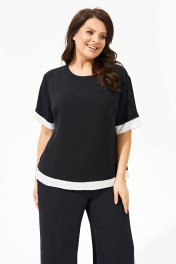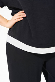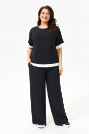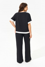 Костюм женский с брюками и блузой свободного силуэта выполнен из легкой струящейся ткани. Блуза с круглым вырезом горловины, рукава со спущенной линией плеча, низ блузы и манжета дополнены планками той же ткани белого цвета. Брюки прямые свобного кроя на притачном поясе-резинке с функциональными карманами в боковых швах. Костюм прошел тестовую стирку при температуре 30 градусов (не линяет). Костюм соответствует размеру. Пожалуйста, пользуйтесь таблицей измерений готового изделия.