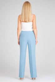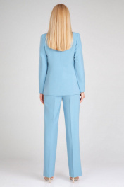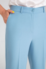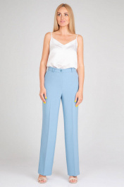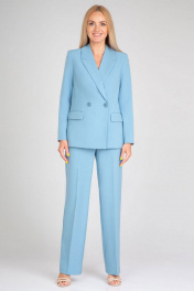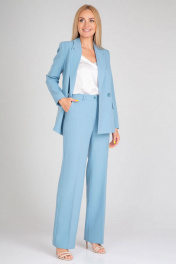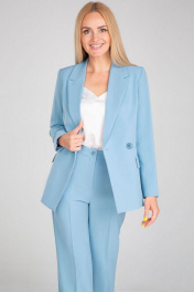 Брючный костюм-двойка. Двубортный жакет полуприталенного силуэта с застежкой на пуговицы. Отложной воротник с лацканами. Перед и спинка с талиевыми рельефами. Спереди горизонтальные карманы с клапанами, в рамку. Спинка со средним швом. Рукава двухшовные. Жакет на подкладке. Прямые брюки со стрелками. Высокая посадка на талии. Притачной пояс со шлевками, по спинке сосборен на резинку для комфортной посадки. Застежка на молнию и пуговицу. Спереди косые боковые карманы, по спинке имитация горизонтальных карманов с листочкой.