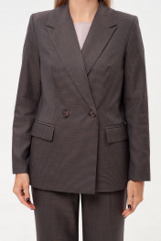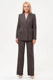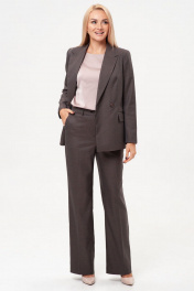 Брючный костюм-двойка. Двубортный жакет полуприталенного силуэта с застежкой на пуговицы. Отложной воротник с лацканами. Перед и спинка с талиевыми рельефами. Спереди горизонтальные карманы с клапанами, в рамку. Спинка со средним швом. Рукава двухшовные. Жакет на подкладке. Прямые брюки со стрелками. Высокая посадка на талии. Притачной пояс со шлевками, по спинке сосборен на резинку для комфортной посадки. Застежка на молнию и пуговицу. Спереди косые боковые карманы, по спинке имитация горизонтальных карманов с листочкой.