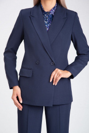 Брючный костюм-двойка. Двубортный жакет полуприталенного силуэта с застежкой на пуговицы. Отложной воротник с лацканами. Перед и спинка с талиевыми рельефами. Спереди горизонтальные карманы с клапанами, в рамку. Спинка со средним швом. Рукава двухшовные. Жакет на подкладке. Прямые брюки со стрелками. Высокая посадка на талии. Притачной пояс со шлевками, по спинке сосборен на резинку для комфортной посадки. Застежка на молнию и пуговицу. Спереди косые боковые карманы, по спинке имитация горизонтальных карманов с листочкой.