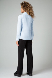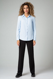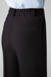 Прямые от бедра брюки-палаццо со стрелками. Высокая посадка на талии. Притачной пояс со шлевками, по спинке сосборен на резинку для комфортной посадки. Застежка на молнию и пуговицу. Спереди косые боковые карманы, по спинке имитация горизонтальных карманов с листочкой.
