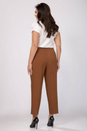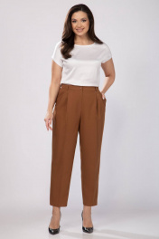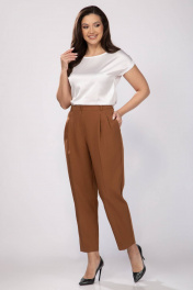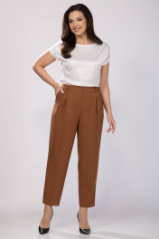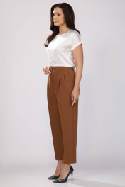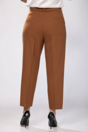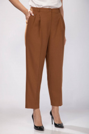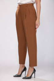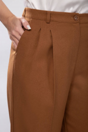Свободные укороченные брюки со стрелками. Высокая посадка на талии, притачной пояс со шлевками. Застежка на молнию и пуговицу. Спереди в шов пояса заложены симметричные складки. Центральные складки переходят в стрелки. Спереди косые боковые карманы. Сзади имитация горизонтальных карманов с листочкой.