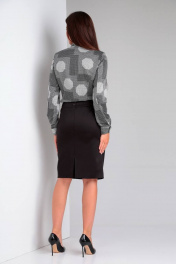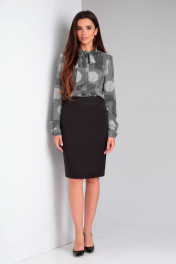 Комплект женский2-х предметный блуза и юбка. Юбка с застежкой на потайную молнию в среднем шве задней половинке. Выполнена из костюмного полотна типа плотный атлас. Верхний срез юбки обработан притачным поясом, застегивающимся на петли-пуговицами. Юбка прямая слегка заужена к низу. Задняя половинка юбки с талевыми выточками, встречной складкой, переходящей в разрез. Юбка на подкладке. Блуза с цельнокроеной бортовой застежкой на петли-пуговицы. Воротник стойка сложной формы, на концах воротника пробиты петли и пришиты пуговицы. По середине стойки пришита петля. В которую продевается отделочная деталь, которая завязывается в бант. Рукава втачные двушовные с манжетой на пуговицы, полной длины. Перед блузы с рельефами от проймы. Спинка с талевыми выточками. Блуза с плечевыми накладками. Размеры: 46, 48, 50 Длина блузы - 56 см, обхват груди -96/100/104, обхват бедер - 102/106/110, длина рукава - 64,5 см, ширина рукава - 17 см Длина юбки -61 см, обхват талии - 78/82/86, обхват бёдер -100/104/108.