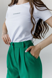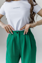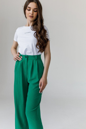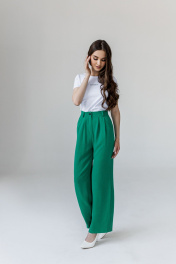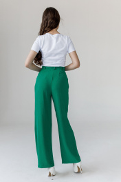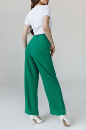 Брюки женские, свободного силуэта, с равномерным расширением по всей длине. Передние половины брюк с 2 глубокими складками по линии талии, с наклонными карманами с отрезной боковой частью; застежкой на тесьму "молнию" в среднем шве. По задним половинкам брюк 2 выточки по линии талии. Верхний срез брюк обработан притачным поясом с 5 шлевками для поддержания ремня.