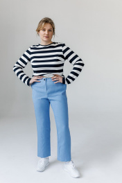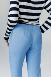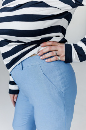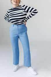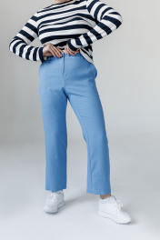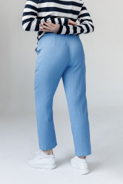 Брюки женские, прямого силуэта, с рплавным заужением к низу. По переду брюк 2 выточки по линии талии, с наклонными карманами с отрезной боковой частью; застежкой на тесьму "молнию" в среднем шве. По спинке 2 выточки по линии талии. Верхний срез брюк обработан притачным поясом с резинкой по спинке и 5 шлевками для поддержания ремня.