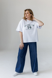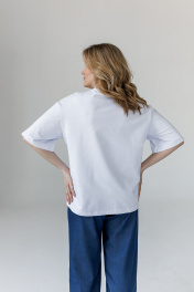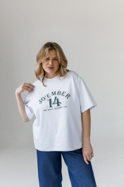 Футболка оверсаз, свободного прямого кроя, со спущенной линией плеча. Горловина округлой формы, обработана бейкой. Рукава длиной до линии локтя. Длина изделия ниже бедра. Низ изделия и рукава обработаны швом в подгибку с открытым срезом на плоскошовной машине.