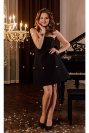 Платье корсетного типа без бретелей с расширением к низу. Перед с вертикальными рельефами и подрезами по линии талии и ниже линии груди. Спинка со средним швом и рельефами. Застежка на потайную тесьму-молнию в боковом шве. По рельефам спинки и переда до линии талии вставлена регилиновая тесьма для сохранения формы, такая же тесьма вставлена в сьёмный бант спинки, который является изюминкой платья.