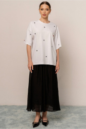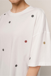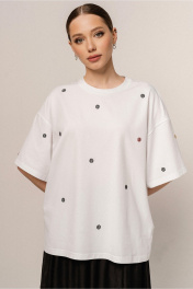 поступит на склад через 7 дней Джемпер молодежный из трикотажного полотна(кулирка) , прямого обьемного силуэта со спущенным рукавом и округлой линией горловины . По переду принт стразами горошек Длина 68 см ширина по линии груди и бедер 58см. (42-48рр) Длина рукава 20 см длина плеча 23 см
