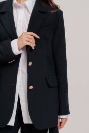 Жакет прямого силуэта на подкладке с центральной застежкой по переду на две петли и две мет.декоративные пуговицы, с втачным рукавом на слегка спущенной линией плеча, с воротником пиджачного типа и лацканами. Полочка с нагрудной выточкой, декорирована карманом с листочкой по левой полочке на уровне груди и 2-мя карманами с клапанами. Спинка с рельефами и двумя шлицами. Длина 72см. ширина изделия на уровне глубины проймы 48,5 50,5 52,5 54,5 56,5см (42,44,46,48,50рр) ширина по линии талии 46,48,50,52,54см соответственно ширина по бедрам 52,54,56,58,60см Длина рукава 62см .