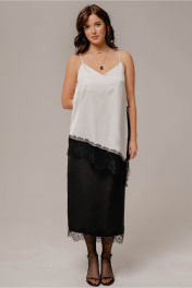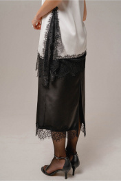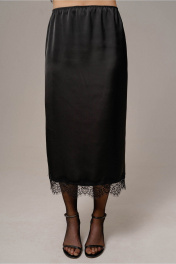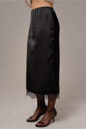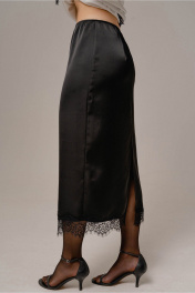 Юбка женская прямого силуэта,без застежки,из ткани шелк Армани ,однотон,с эластичной тесьмой по верху шириной 1 см. Спинка со средним швом с разрезом по низу,талиевые вытачки.По низу изделия пратачано кружево. Длина по ЗП -85см, ширина по талии в стянутом виде 32,34,36,39,41см (42,44,46,48,50рр) , ширина по бедрам 49,51,53 ,55,57см соответственно