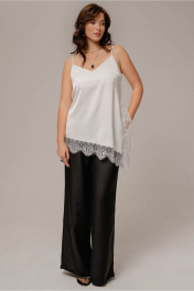 Топ женский молодежный трапециевидного силуэта ,без застежки на регулируемых бретелях из ткани атлас с содержанием хлопка,с отделкой кружевом по низу и разрезу по боковому шву,с ассиметрией по низу. Длина по боковому шву короткого( от плеча) 47 см, длина по боковому шву длинному 67 см ширина на уровне глубины проймы 47,49,51,53см (42,44,46,48рр) ширина по низу 51,53,55,57см, соответственно.