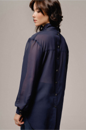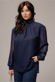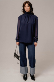 Блузка из шифона , прямого силуэта. С застежкой по спинке на петли-пуговицы ,рукав рубашечного типа на притачной манжете. Перед двойной со сборкой по линии горловины,спинка с кокеткой.Воротник стойка. Длина 74 см. ширина на уровне глубины проймы 54,5;56,5;58,5:60,5.см (42,44,46,48 р) ширина по талии 54,5;56,5;58,5:60,5.см смсоответственно ширина на уровне бедер 55,5;57,5;59,5;61,5. см. Длина рукава 59 см