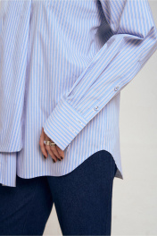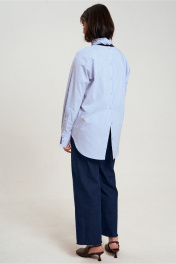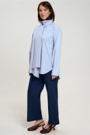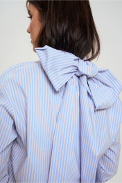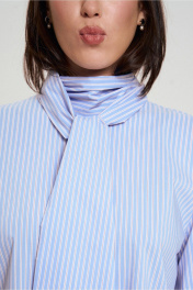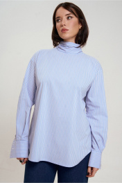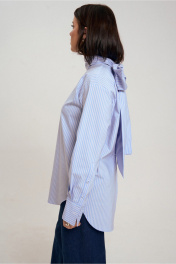 Блузка из ткани в полоску , прямого силуэта. С застежкой по спинке на петли-пуговицы( пуговицы обтянуты в ткань блузки) со спущенной линией плеча и манжетой по низу. Перед без швов,воротник стойка.Горловина округлой формы воротником шарфом втачен только по переду Длина 76 см. ширина на уровне глубины проймы 55,57,59см (42,44,46 р) ширина по талии 55,57,59см соответственно ширина на уровне бедер 55,57,59 см. Длина рукава 60 см длина банта 47 см