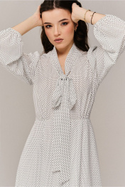 срок пошива модели 7 дней Платье женское из ткани креп в мелкий горошек на подкладке ( нижняя часть платья). Полуприлегающего силуэта, рукав рубашечного типа длиной до запястья со сборкой на эластичную тесьму по низу,с центральной застежкой по лифу на пуговички и петли. Горловина Y образной формы с шарфом по ней. Отрезное по линии талии. Длина платья 127 см, ширина уровне глубины проймы 45;47;49;51см (42,44,46,48рр.) ширина по талии 35,37,39,41см (42,44,46,48рр), ширина по линии бедер 52,54,56,58 см соответственно. Длина рукава 58 см