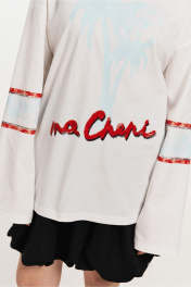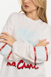 Джемпер молодежный из трикотажного полотна со спущенной линией плеча, и рукавом длиной до запястья и расширением к линии низа,горловина округлой формы. По переду принт в голубом цвете пальмы и надпись принт по рукавам и спинке Длина 68 см. ширина по линии груди 56;60см. ( 42-44os1)(46-48os2 ) ширина по низу 56,60 см . Длина плеча 22.5 см. Длина рукава 61,5 см . Ширина рукава внизу 17,5 см