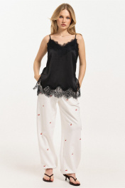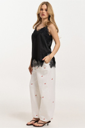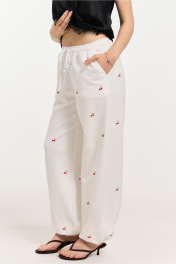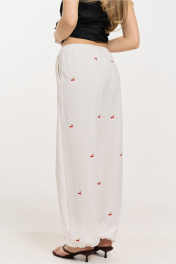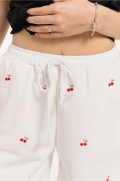 Брюки (джоггеры)молодежные из трикотажного полотна3 х нитка , О образной формы,на поясе с резинкой и шнурком , с наклонными карманами по переду. Низ брюк на регулировке. Декор принт вишенки по переду и спинке. Длина по боковому шву 98 см, ширина по талии 34,36,38,40см (42,44,46,48рр) ширина по бедрам 56,58,60,62см соответственно ширина по низу 28 см