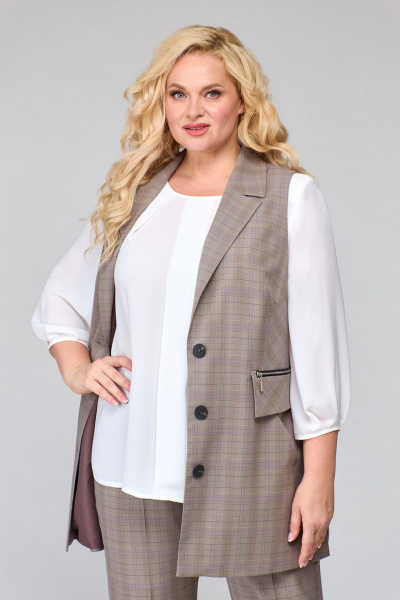 Комплект брючный 3-х предметный изготовлен из костюмной ткани состоит из жилета, брюк и блузки. Жилетка изготовлена из костюмной ткани в клетку, прямого силуэта. Воротник пиджачного типа, застежка центрально-бортовая на три петли и пуговицы. Перед с фигурными боковыми деталями, в которых обработаны карманы и клапаны. Спинка разрезная по линии талии. Жилетка на подкладке. Брюки изготовлены из костюмной однотонной ткани, средней посадки. Пояс частично на резинке. По передним деталям брюк обработаны карманы. По низу небольшие разрезы. Блузка изготовлена из вискозной ткани, свободного силуэта. Горловина обработана окантовкой. По центру переда складка, имитирующая застежку, и две складки у горловины. Спинка с встречной складкой. Рукава втачные длиной ¾, по низу рукава заложены небольшие складки. Обращаем Ваше внимание, что цвет на экране может отличаться от реального. Длина жилета по спинке – 78 см. р.52 – ПОГ 56 см, ПОБ 61 см, р.54 – ПОГ 58 см, ПОБ 63 см, р.56 – ПОГ 60 см, ПОБ 65 см, р.58 – ПОГ 62 см, ПОБ 67 см, р.60 – ПОГ 64 см, ПОБ 69 см. Длина брюк по боковому шву 102 см. р.52 – ПОБ 54 см, р.54 – ПОБ 56 см, р.56 – ПОБ 58 см, р.58 – ПОБ 60 см, р.60 – ПОБ 62 см. Длина джемпера по спинке – 65 см, рукава – 48 см. р.52 – ПОГ 58 см, ПОБ 62 см, р.54 – ПОГ 60 см, ПОБ 64 см, р.56 – ПОГ 62 см, ПОБ 66 см, р.58 – ПОГ 64 см, ПОБ 68 см, р.60 – ПОГ 66 см, ПОБ 70 см.