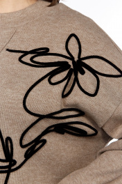 Костюм брючный двухпредметный, выполнен из трикотажного полотна. Состоит из джемпера и брюк. Джемпер свободного силуэта, горловина обработана воротником-стойка. Перед разрезной, швы декоративно отстрочены. Спинка со средним швом. В боковых швах имеются разрезы. Рукав спущенный, длинный. Джемпер декорирован дизайнерской вышивкой. Брюки со средней посадкой прямого кроя. Пояс притачной на эластичной тесьме дополнен шнуром. В передних деталях брюк обработаны карманы. Обращаем Ваше внимание, что цвет на экране может отличаться от реального. Описание Длина джемпера по спинке — 72 см, длина плеча + рукав — 72 см. р.50 — ПОГ 60 см ПОБ 61 см, р.52 — ПОГ 62 см ПОБ 63 см, р.54 — ПОГ 64 см ПОБ 65 см, р.56 — ПОГ 66 см ПОБ 67 см, р.58 — ПОГ 68 см ПОБ 69 см, р.60 — ПОГ 70 см ПОБ 71 см. Длина брюк по боковому шву — (107-108) см. р.50 — ПОТ 36 см ПОБ 55 см, р.52 — ПОТ 38 см ПОБ 57 см, р.54 — ПОТ 40 см ПОБ 59 см, р.56 — ПОТ 42 см ПОБ 61 см, р.58 — ПОТ 44 см ПОБ 63 см, р.60 — ПОТ 46 см ПОБ 65 см.