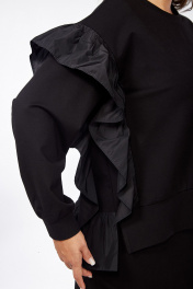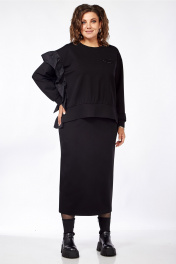 Костюм женский юбочный, изготовлен из трикотажного полотна. Джемпер свободного кроя, Горловина круглой формы. Рукав спущенный. Декоративными элементами являются рюша из отделочной ткани и печать, декорирована стразами. Низ рукавов на манжетах. Спинка длиннее переда, по низу спинки притачная рюша из отделочной ткани. Юбка зауженная, на подкладке, пояс на резинке. Сзади средний шов и разрез внизу. Обращаем Ваше внимание, что цвет на экране может отличаться от реального. Длина джемпера по спинке — 66 см, рукава — 54 см р.46 — ПОГ 56 см, ПОБ 52 см, р.48 — ПОГ 58 см, ПОБ 54 см, р.50 — ПОГ 60 см, ПОБ 56 см, р.52 — ПОГ 62 см, ПОБ 58 см, р.54 — ПОГ 64 см, ПОБ 60 см, р.56 — ПОГ 66 см, ПОБ 62 см. Длина юбки — 90 см р.46 — ПОБ 50 см, р.48 — ПОБ 52 см, р.50 — ПОБ 54 см, р.52 — ПОБ 56 см, р.54 — ПОБ 58 см, р.56 — ПОБ 60 см.