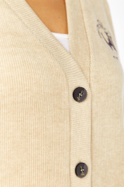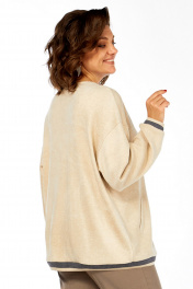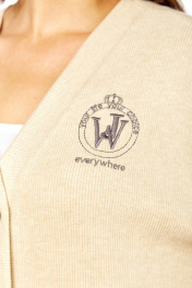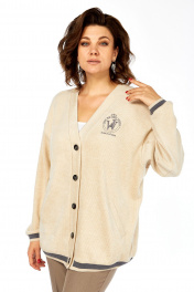 Кардиган женский, изготовлен из трикотажного полотна. Горловина V-образной формы, застежка отрезная планка на петли и пуговицы. Карманы с листочками. По низу изделия и низу рукавов-декоративные довязы. Спинка цельнокроенная. Рукава спущенные длинные. Отделочный элемент — вышивка на детали переда. Длина кардигана по спинке — 70 см, длина плеча + рукав — 77 см. р.52 — ПОГ 61 см ПОБ 61 см, р.54 — ПОГ 63 см ПОБ 63 см, р.56 — ПОГ 65 см ПОБ 65 см.