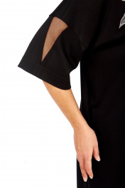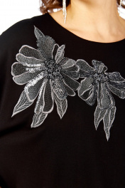 Платье женское нарядное, изготовлено из трикотажного полотна. Горловина круглой формы. На полочке дизайнерская вышивка. Спинка со средним швом и декоративным вырезом с сеткой вверху. Рукава спущенные, длиной ¾ со вставкой из сетки. Обращаем Ваше внимание, что цвет на экране может отличаться от реального. Длина платья по спинке — 106 см, длина плеча + рукав — (50-51 см). р.50 — ПОГ 65 см ПОБ 58 см, р.52 — ПОГ 67 см ПОБ 60 см, р.54 — ПОГ 69 см ПОБ 62 см, р.56 — ПОГ 70 см ПОБ 63 см, р.58 — ПОГ 72 см ПОБ 65 см, р.60 — ПОГ 74 см ПОБ 67 см.