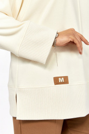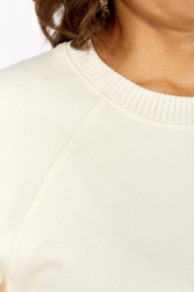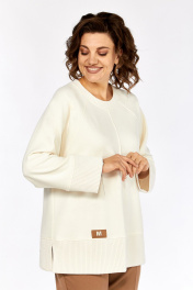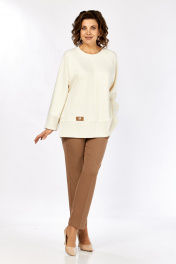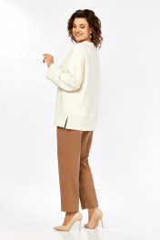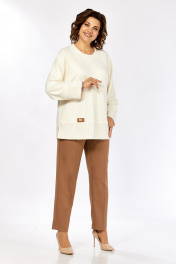 Комплект женский брючный, состоит из джемпера и брюк. Джемпер свободного кроя, изготовлен из трикотажного полотна, комбинированный. Горловина круглой формы. Рукава реглан. В боковых швах обработаны разрезы по низу. Горловина, низ изделия и низ рукавов изготовлены из отделочной ткани. Отделка — нашивка по переду. Брюки классические из костюмной ткани. В брюках обработан пояс, частично на резинке. Застежка на молнию, петлю и пуговицу. В брюках обработаны боковые карманы. Сзади обработана кокетка. Описание Длина джемпера по спинке — 70 см, длина плеча + рукав — 70 см. р.50 — ПОГ 58 см ПОБ 58 см, р.52 — ПОГ 60 см ПОБ 60 см, р.54 — ПОГ 62 см ПОБ 62 см, р.56 — ПОГ 64 см ПОБ 64 см. Длина брюк по боковому шву — 99 см. р.50 — ПОТ 39 см ПОБ 54 см, р.52 — ПОТ 41 см ПОБ 56 см, р.54 — ПОТ 43 см ПОБ 58 см, р.56 — ПОТ 45 см ПОБ 60 см.